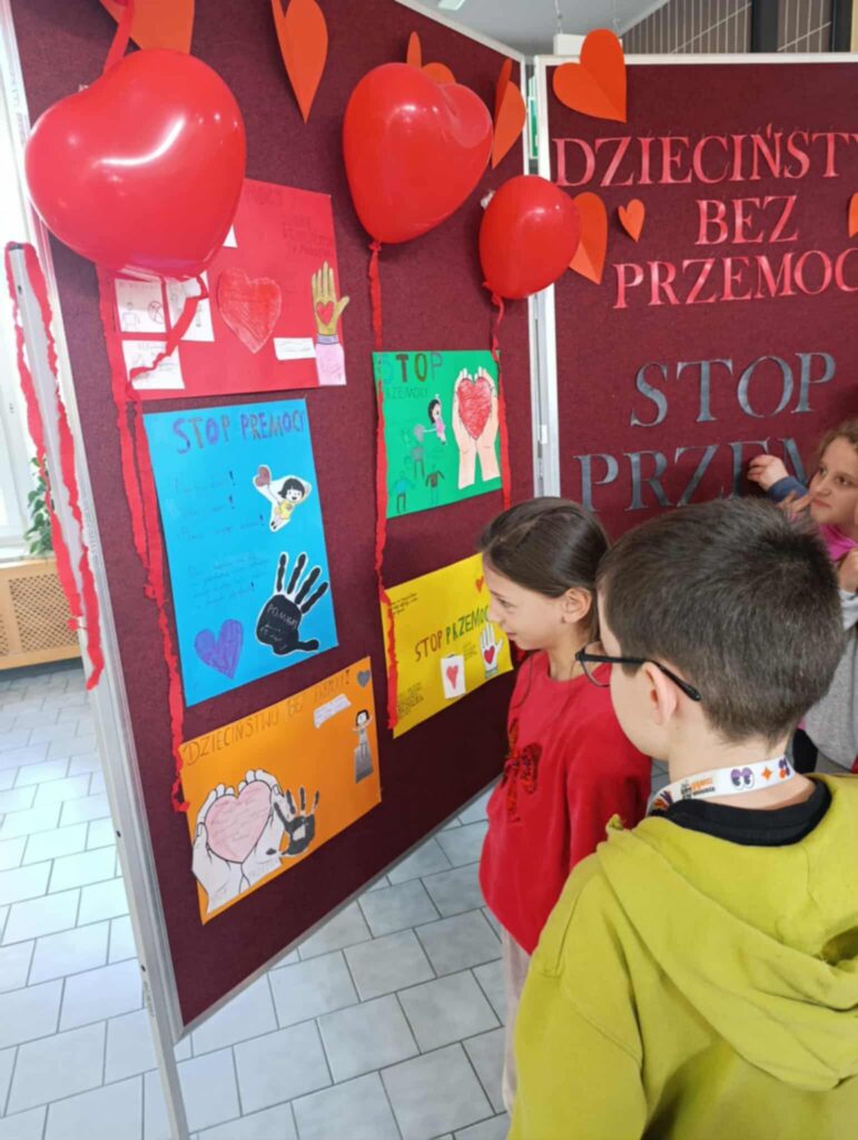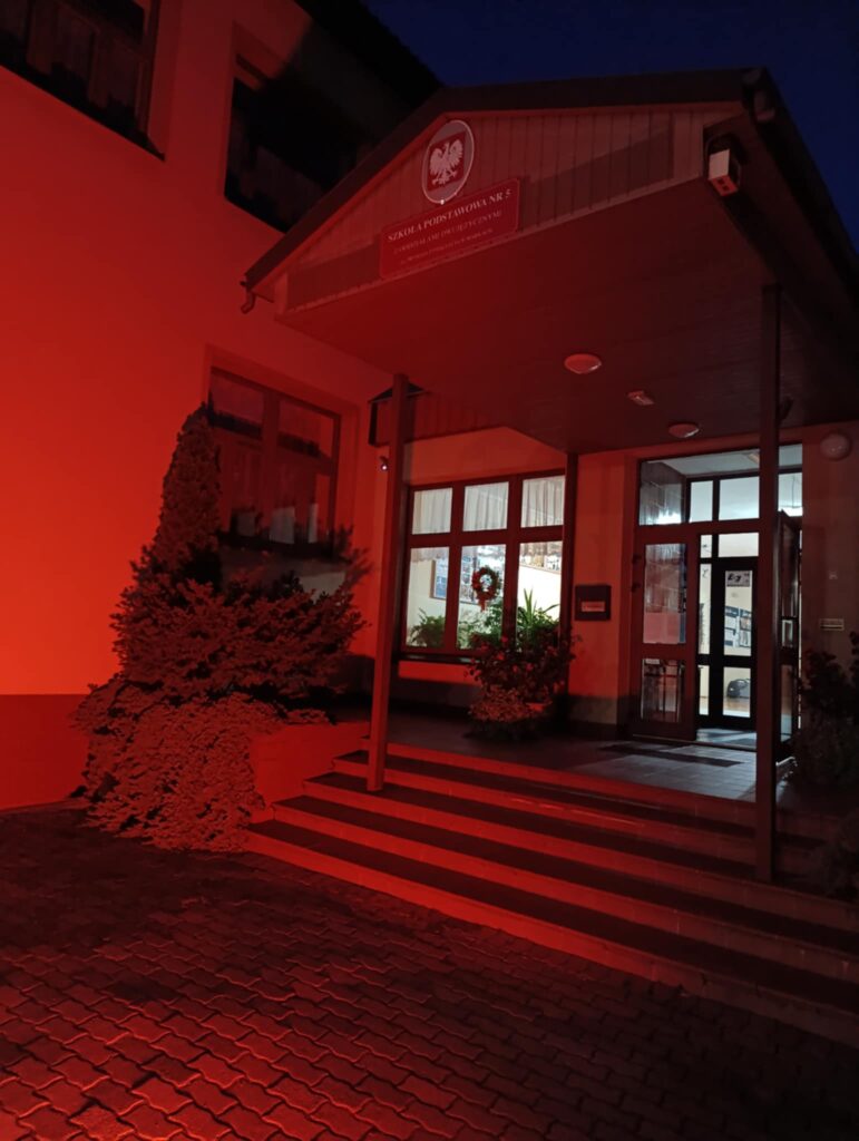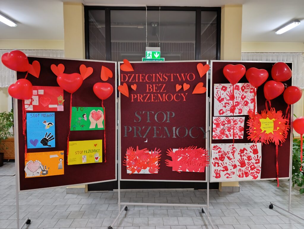 19 listopada 2025 r. nasza szkoła została podświetlona na czerwono – jako symbol sprzeciwu wobec krzywdzenia dzieci. W holu głównym zaprezentowano również wyjątkową wystawę prac uczniów pod hasłem: „Dzieciństwo mocy bez przemocy”.